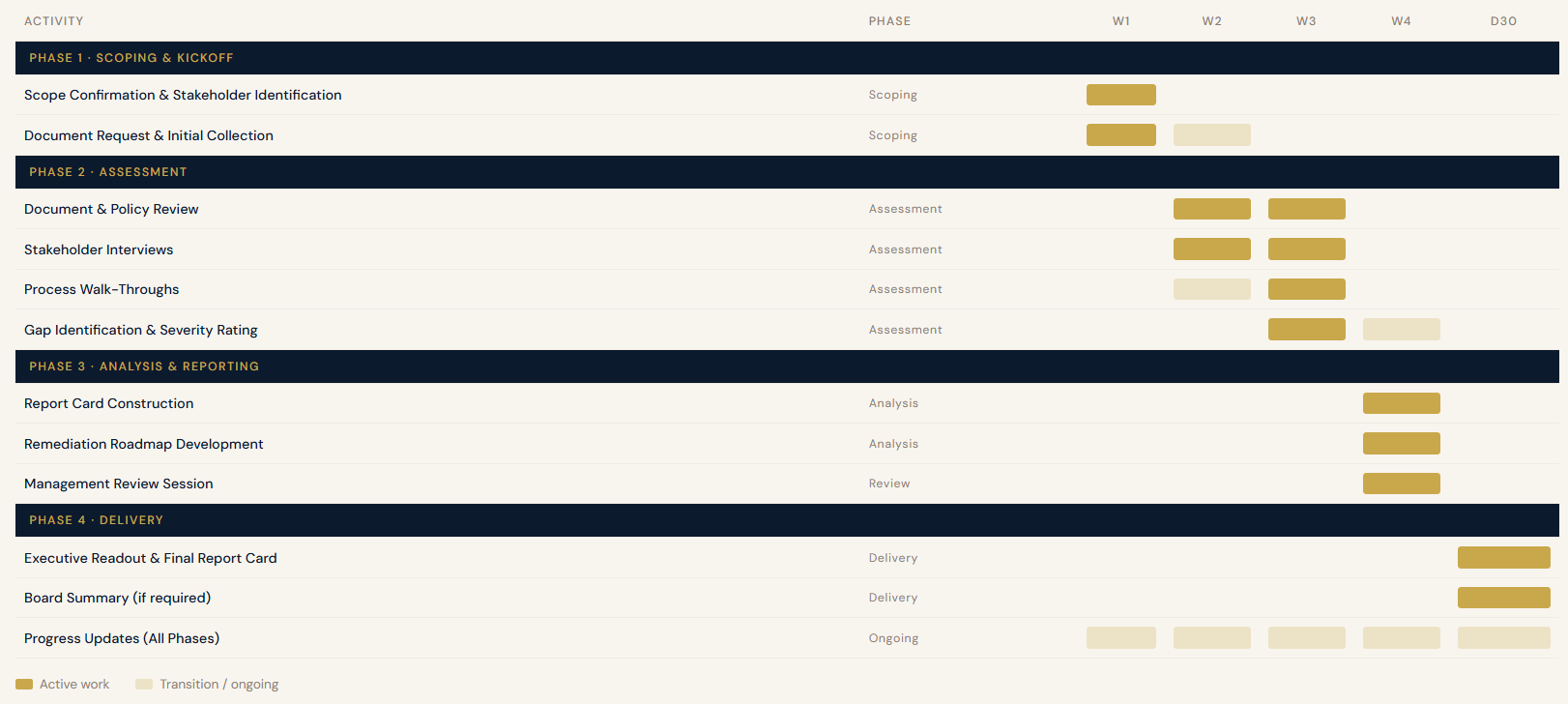 A focused, structured assessment designed to minimize disruption to your team while delivering maximum insight. Senior-led throughout, with clear milestones and a final report card your organization can act on immediately.